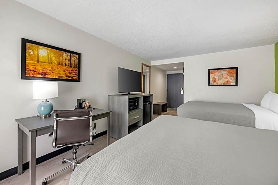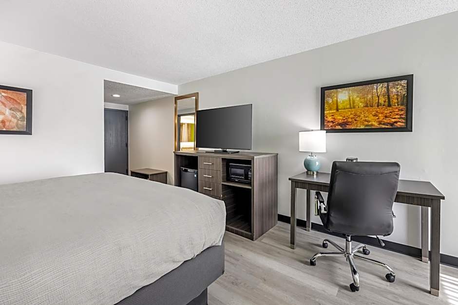 This room features a microwave, refrigerator, and flat-screen TV. A hairdryer and desk are provided.
